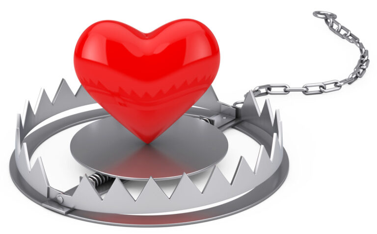 Metal Bear Trap with Red Heart on a white background. 3d Rendering