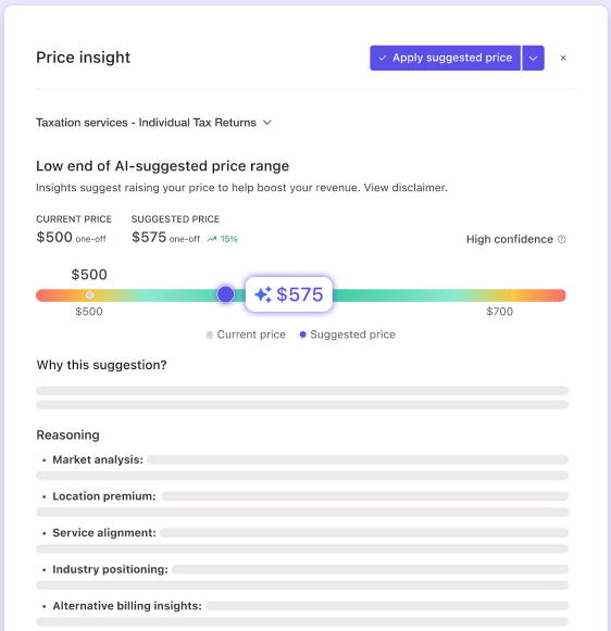 So how does it work? To deliver tailored pricing guidance, Price Insights analyzes a firm’s service details and compares them to similar services from comparable firms using Ignition. Variables such as location, firm profile, and industry are factored in to tailor insights, while the underlying dataset is refreshed regularly to stay relevant.